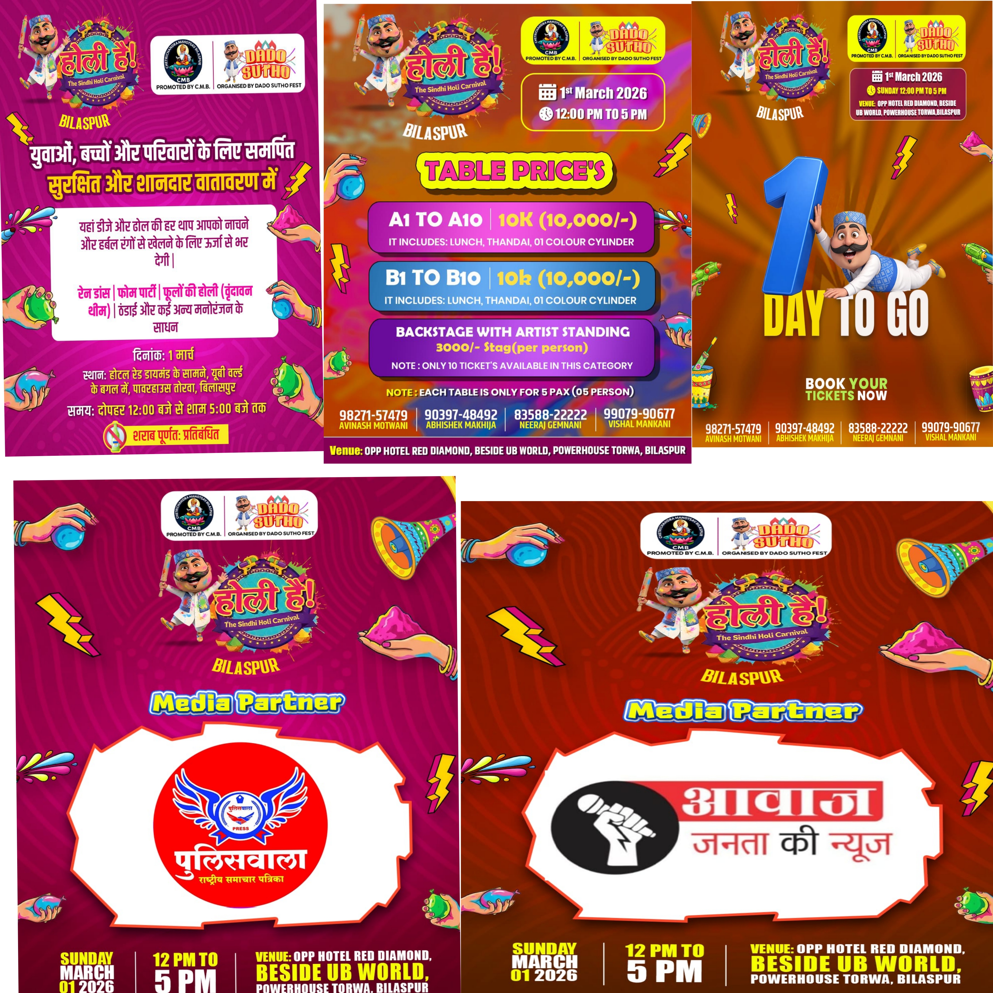 बिलासपुर में 1 मार्च 2026 को "द सिंधी होली कार्निवल" का आयोजन किया जा रहा है, जो युवाओं, बच्चों और परिवारों के लिए समर्पित सुरक्षित और शानदार वातावरण में होगा। इस कार्यक्रम में डीजे और ढोल की धुन पर नाचने का अवसर मिलेगा, साथ ही हर्बल रंगों से खेलने का अनुभव भी होगा।